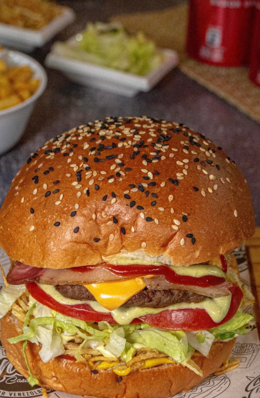 PAN DE HAMBURGUESA, 160GR DE CARNE DE HAMBURGUESA, 2UN DE CHEDDAR, 40GR DE CHORIZO, 40GR DE CHOCLO,70GR DE QUESO MOZARELLA FUNDIDO, 15GR DE LECHUGA, 2 RODAJAS DE TOMATE.