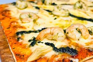 Masa a la piedra, queso mozzarella, camarón salteado, alcachofa, aceite de ajo y salsa pomodoro.