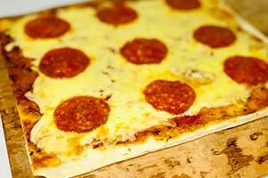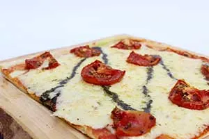 Masa a la piedra, queso mozzarella, tomate, aceite de oliva, aceite de maravilla, albahaca, sal, azúcar, ajo, nuez moscada y pimienta.