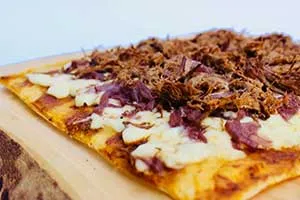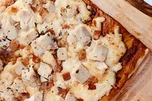 Masa a la piedra, queso mozzarella, pollo, cebolla, salsa barbecue, tocino, sal, aceite de maravilla, azúcar y orégano.