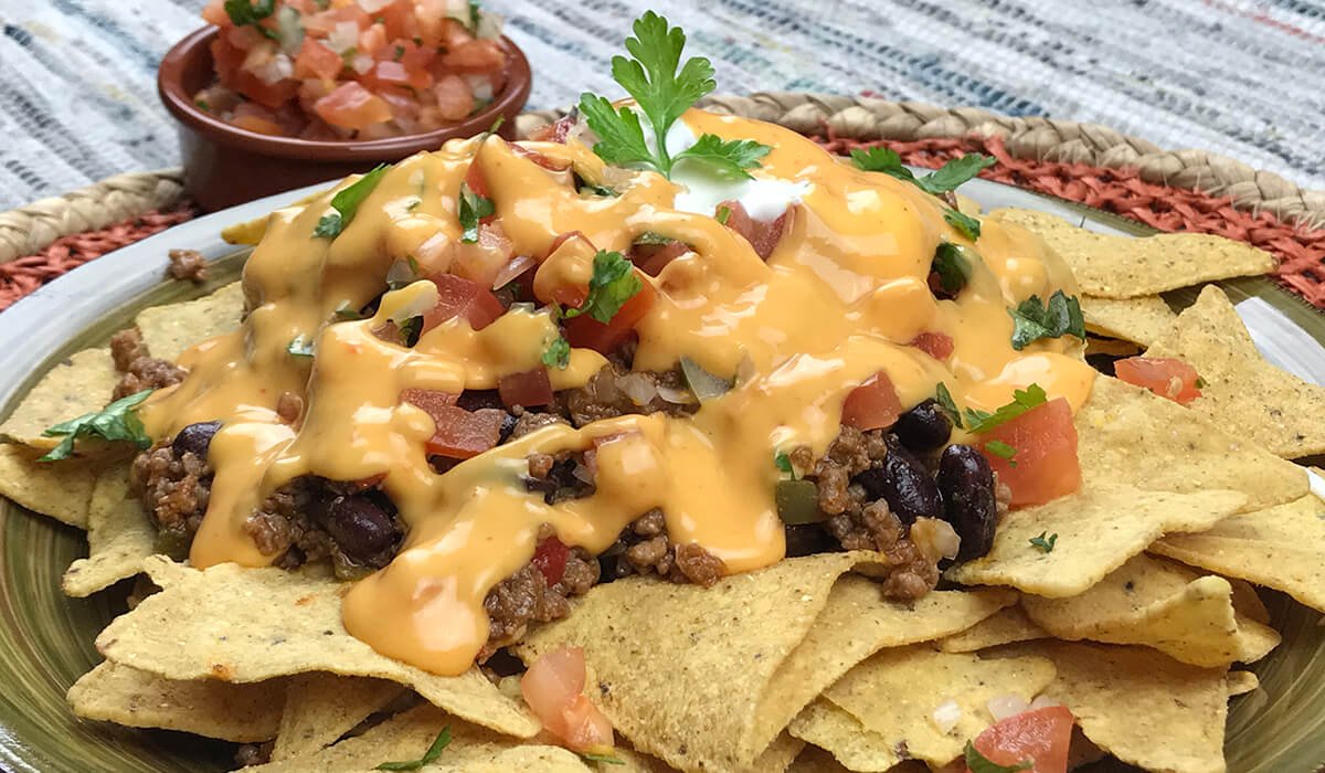 Tortilla, Queso Mozzarella, Queso Cheddar, Carne vacuno, Pollo Acompañada de una salsa Ranch.