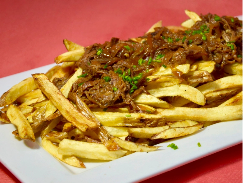 Papas fritas, lomo liso, pollo, chorizo, cebolla, cebollin, salsa de soya, salsa de ostra, huevo.