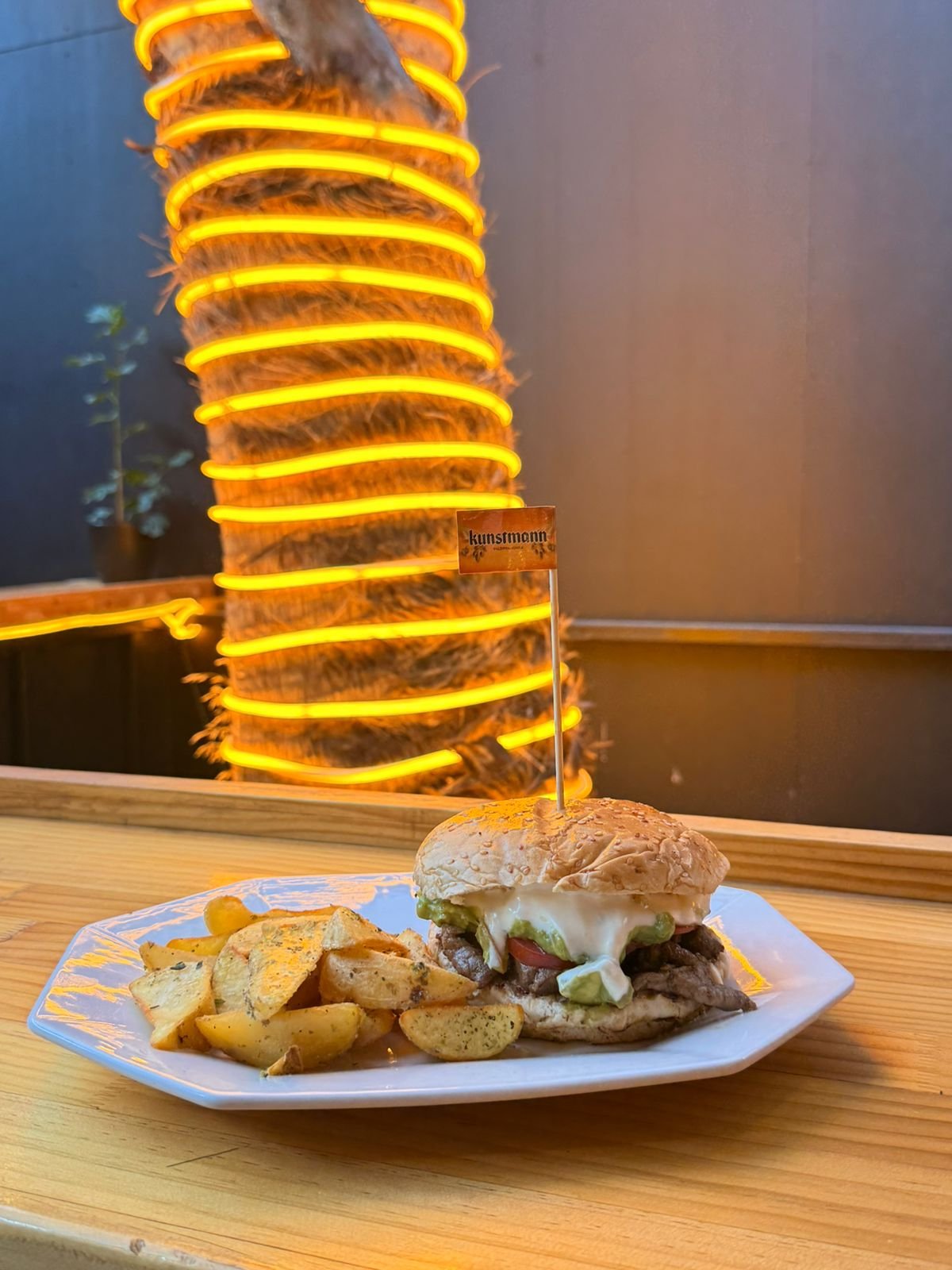 PAN DE HAMBURGUESA, MEDALLON VEGETAL, 200GR DE CEBOLLA MORADA, MAYO VEGANA, PEPINILLO, LECHUGA Y TOMATE.